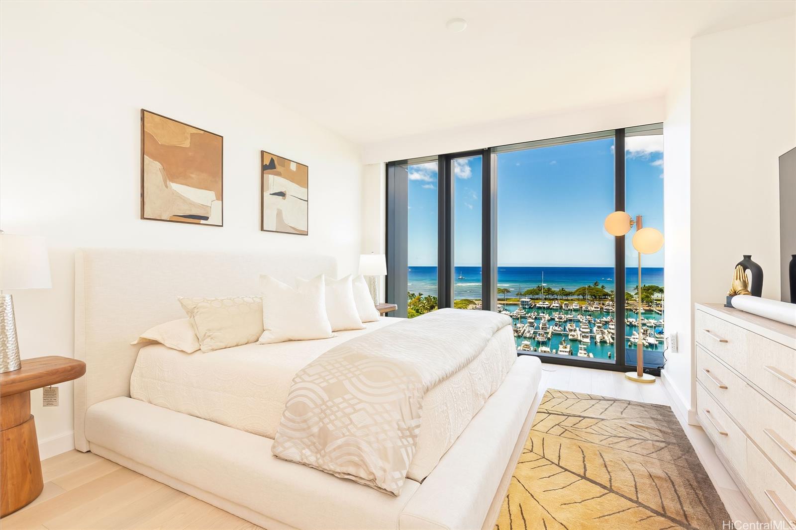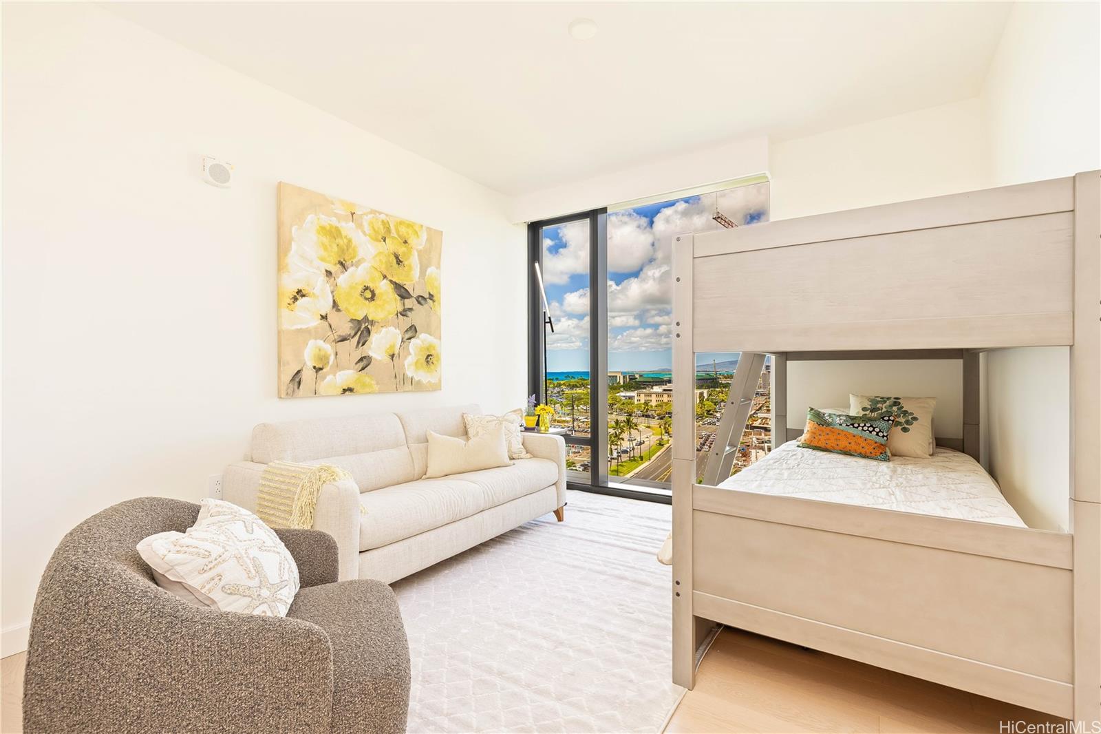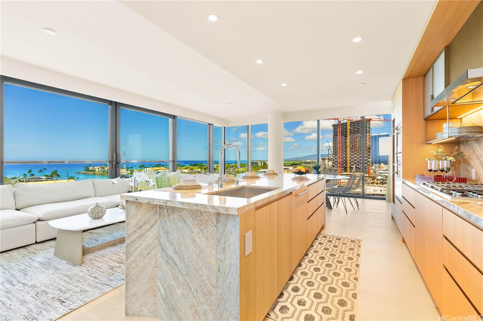 Direct Ocean and Sunset Views! Experience elevated island living in this coveted 3-bedroom, 3-bath residence at Victoria Place, Ward Village’s newest luxury oceanfront address. Floor-to-ceiling glass windows frame sweeping ocean views and golden sunsets with a spacious open-concept layout. Offered fully-furnished in excellent condition with minimal use, the residence features motorized shades throughout, bidet toilets, a custom-designed primary closet system, and a dedicated EV charging station located between rare side-by-side parking stalls, a valuable convenience in urban Honolulu.The refined interior is anchored by a sculptural quartzite island and appointed with Wolf appliances, Sub-Zero refrigerator, light wood flooring, and textured glass cabinetry.Victoria Place offers 24-hour security and a thoughtfully curated collection of resort-style amenities, including pools, a state-of-the-art fitness center, spa, steam and sauna rooms, private lounges, theater, guest suites, and elegant entertaining spaces. Located in the heart of Ward Village, residents enjoy immediate access to shopping, dining, beaches and everyday services, offering effortless luxury living.