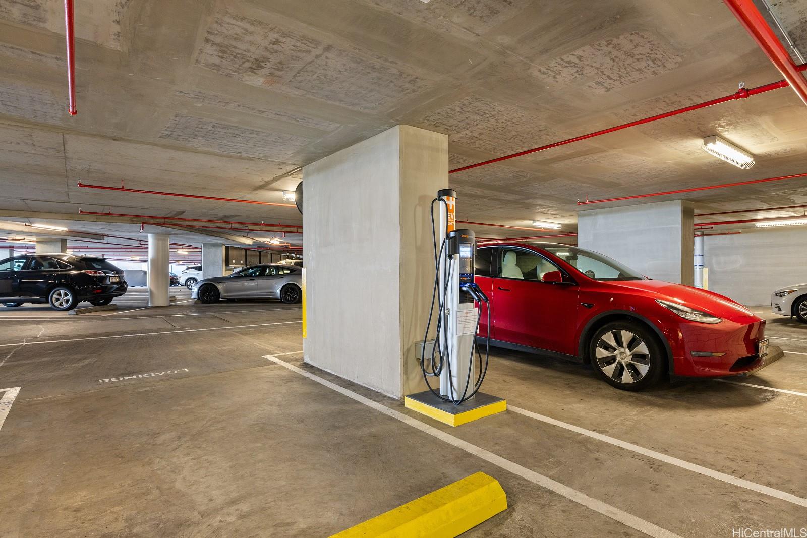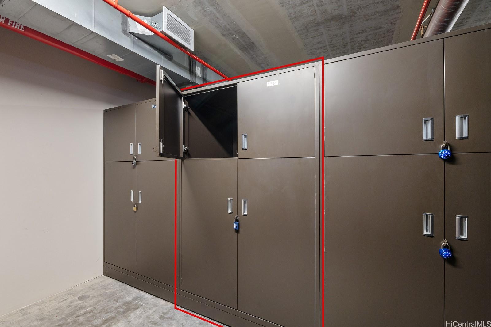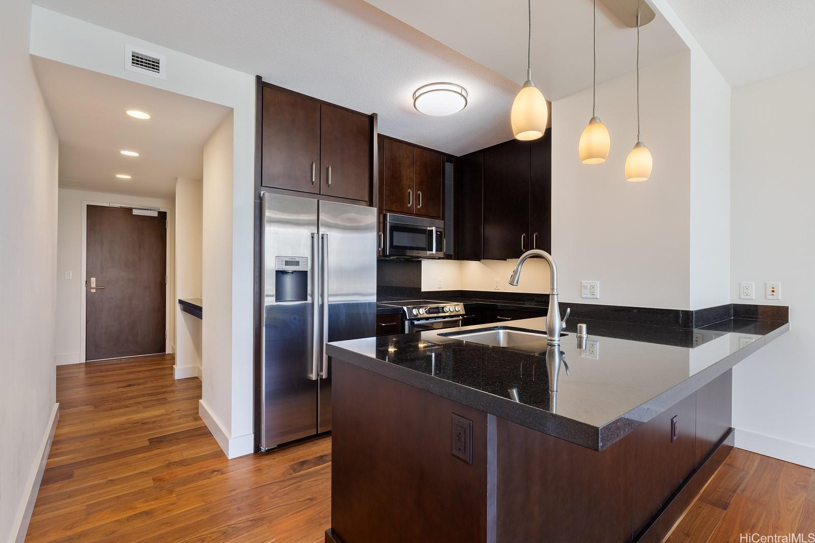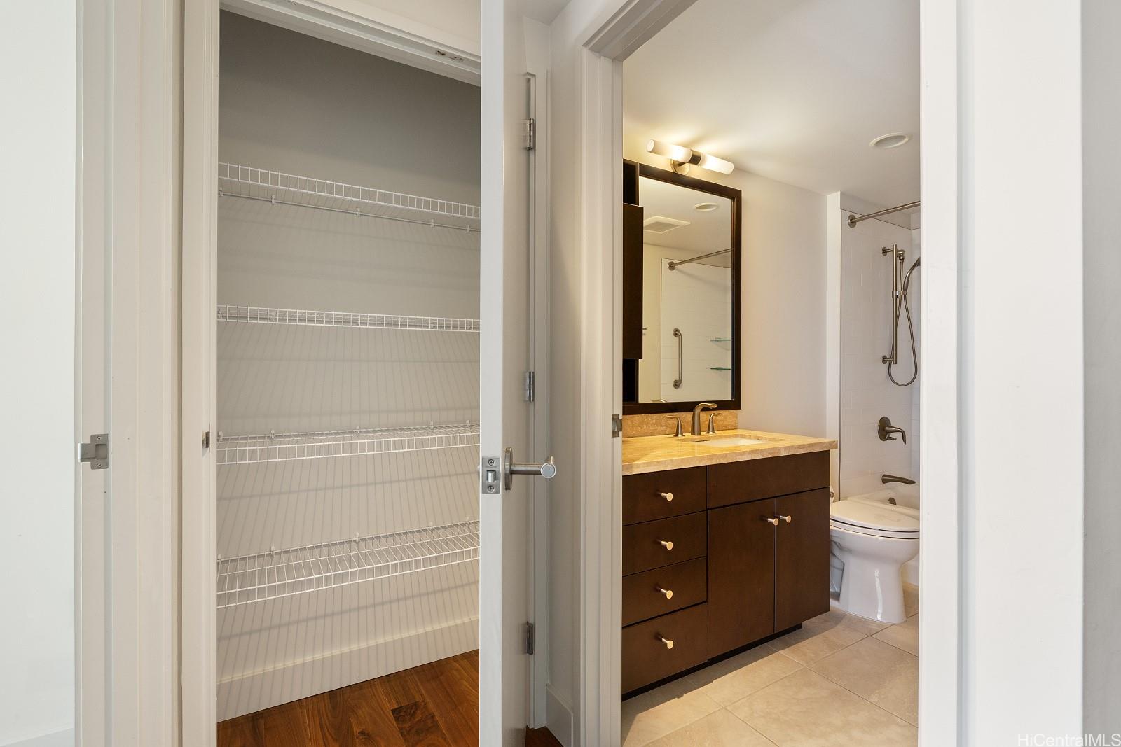 Large 1 bedroom right in town with a convenient parking stall and a large 4 section storage closet in parking garage near the entrance to building. Real wood flooring, motorized sun shade blinds in the living room, manual in the bedroom. Central AC, high end appliances and a full sized washer and dryer. Great views, close to Ala Moana shopping center and future rail station. Walk to the beach and enjoy all of the amenities in the Ward area. Building offers concierge services, guest suites, state of the art fitness center, move theater, pool, whirlpool, bbq’s and cabanas, 24 hour security. This is luxury living to its finest and this is the best priced unit in the area.