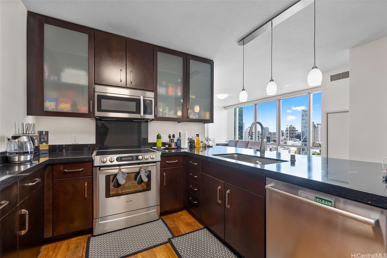 Welcome to Waihonua #2409! Ideally situated between Ala Moana and Ward Village, this residence offers the perfect blend of luxury and convenience at an attractive price. The spacious floor plan showcases ceiling to floor windows offering breathtaking city and mountain views. Unit features include: central a/c, engineered wood flooring, granite countertops, stainless steel appliances, & TWO prime covered parking stalls along with an overhead storage. Resort like amenities include: 24 hour security, guest parking, infinity pool, jacuzzi, fitness center, theater room, guest suites, and PET FRIENDLY as well.