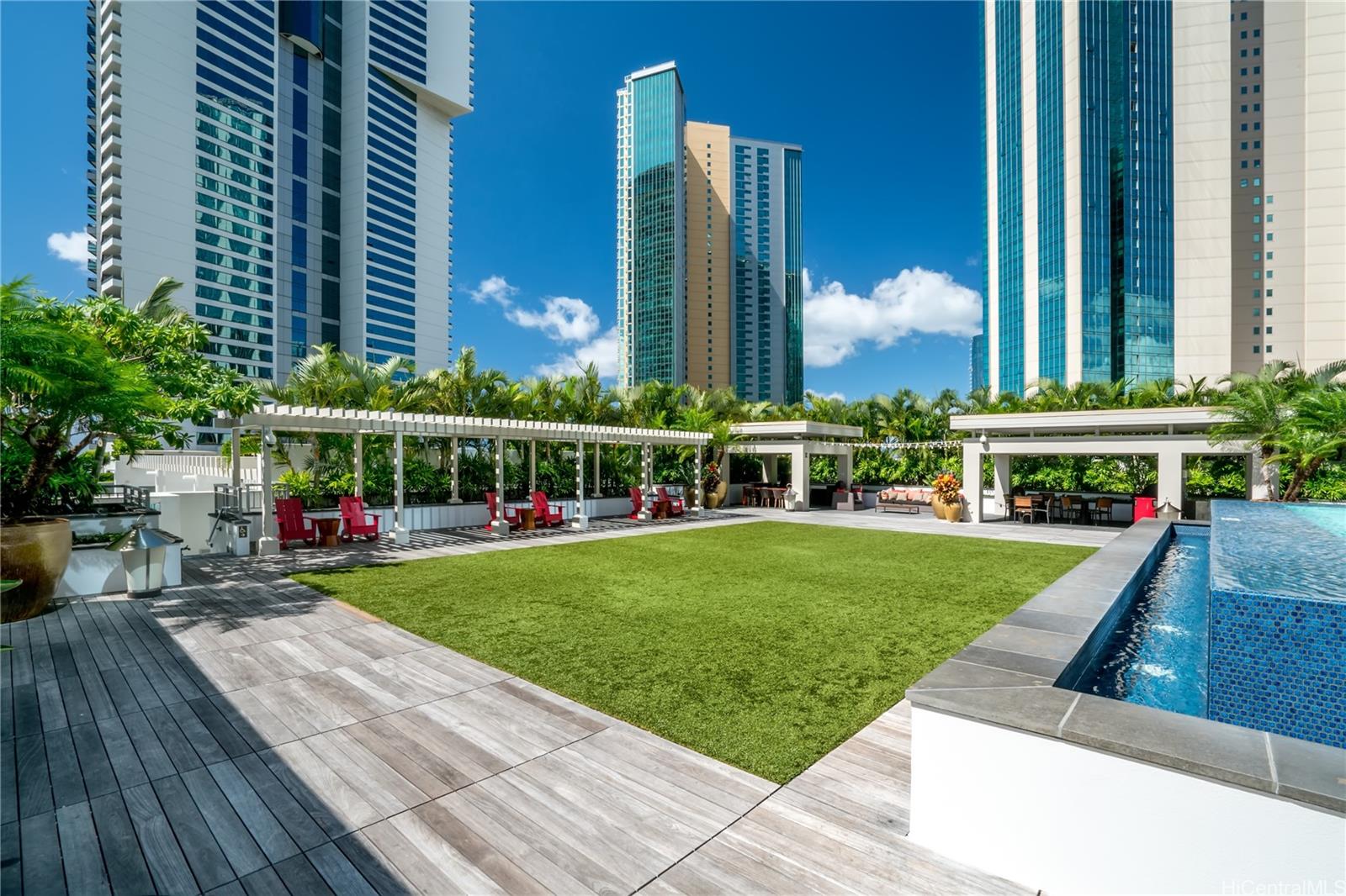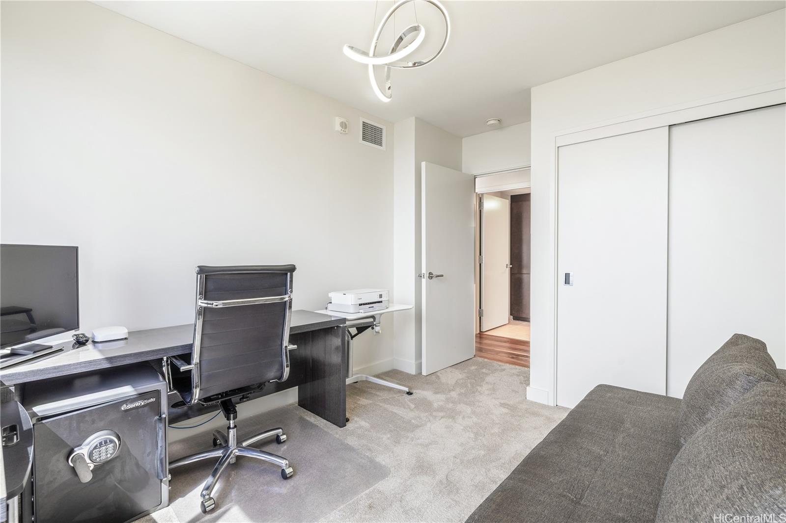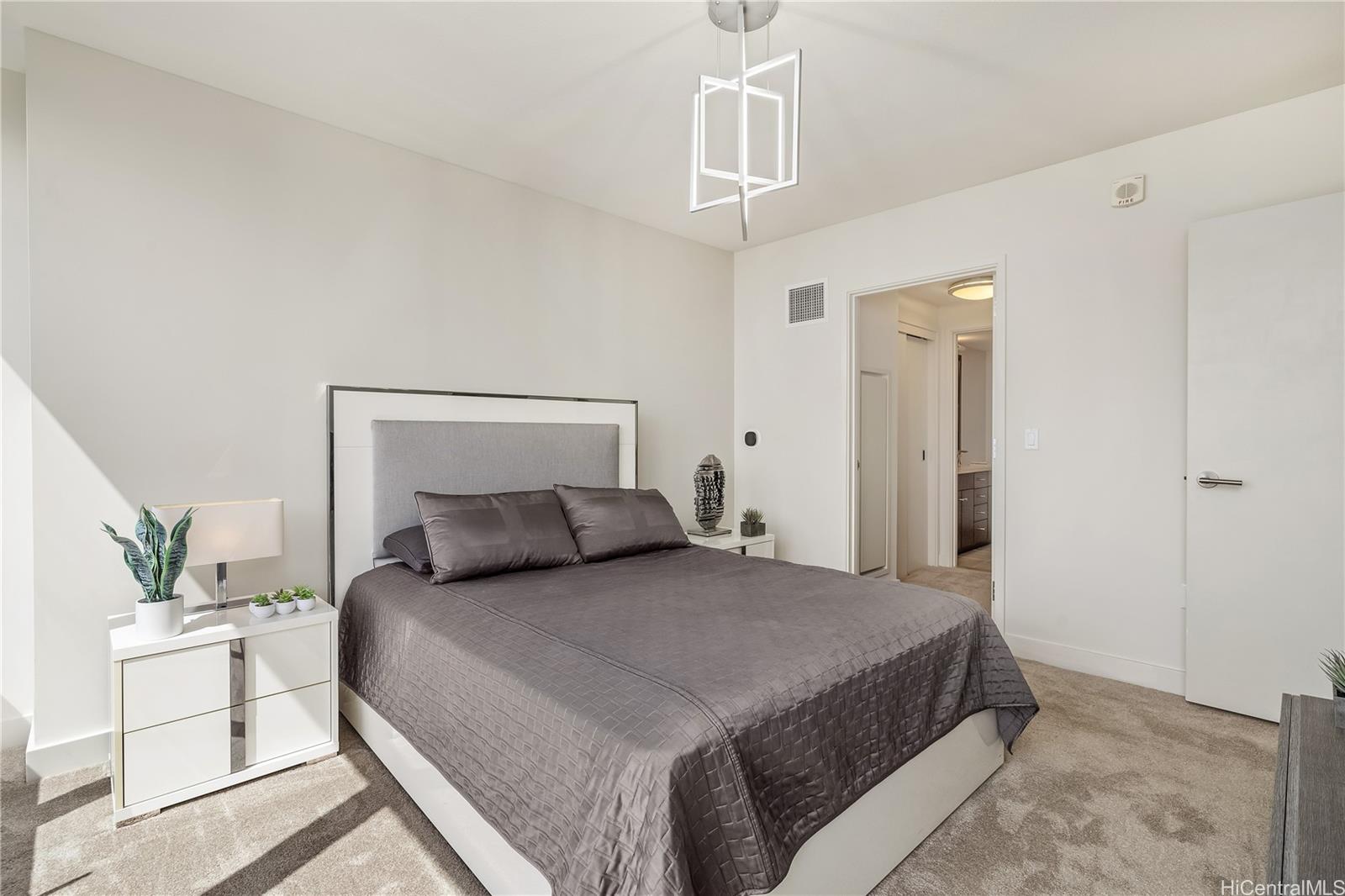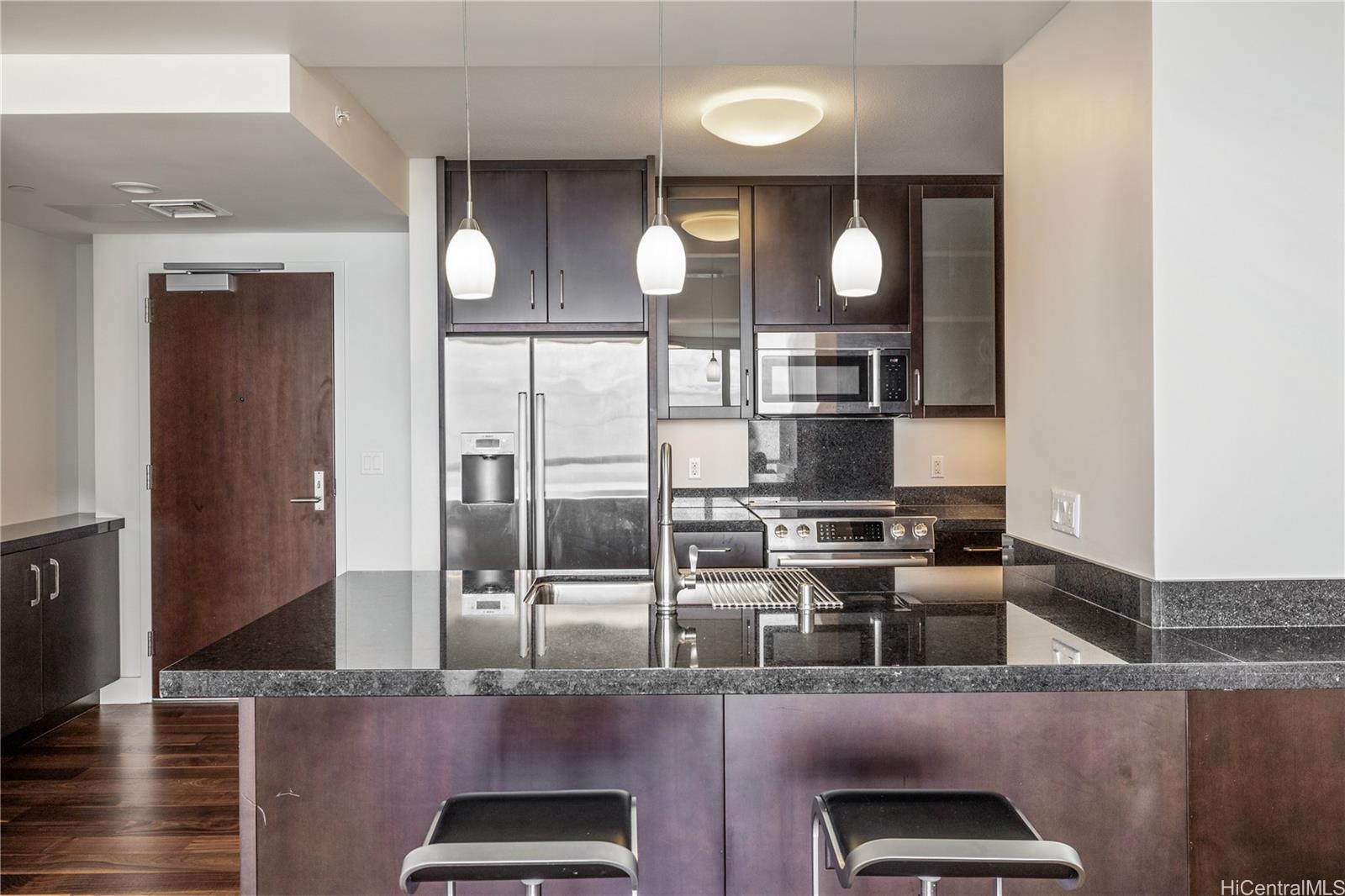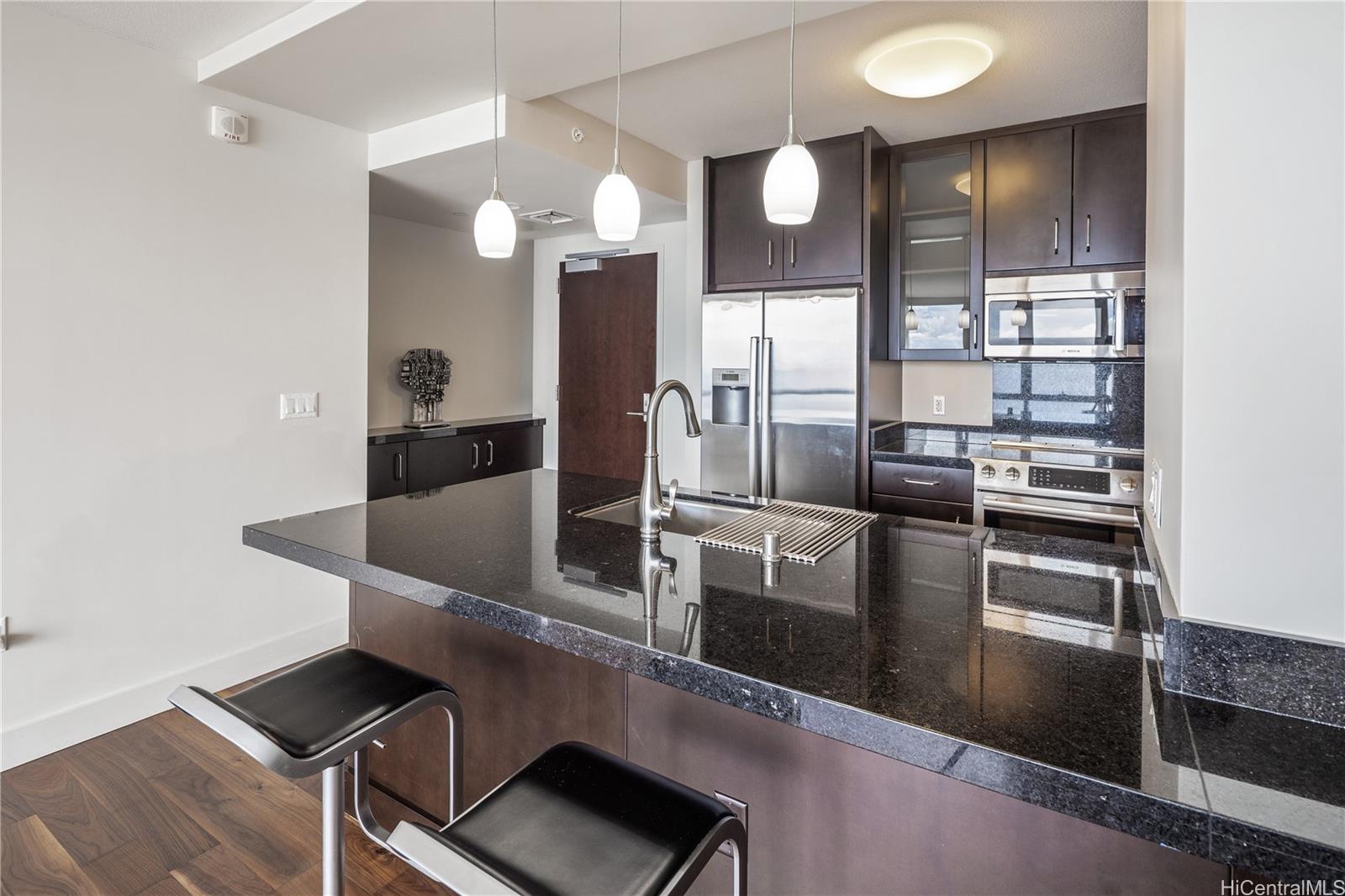 Experience breathtaking ocean and Diamond Head views from this rare 40th-floor residence. Step into a modern home designed for both comfort and style, with floor-to-ceiling windows that fill the space with natural light and an open-concept layout that highlights the stunning vistas. Residents enjoy world-class amenities including a heated swimming pool, whirlpool spa, private cabanas, BBQ pavilions, a stylish club room, theater, lounge, and a state-of-the-art fitness center. Perfectly located just steps from Ala Moana Beach Park and Ala Moana Shopping Center, and one block from Ward Village, this residence offers the ultimate blend of luxury, convenience, and island living. Brand new flooring and new Refrigerator is a plus!