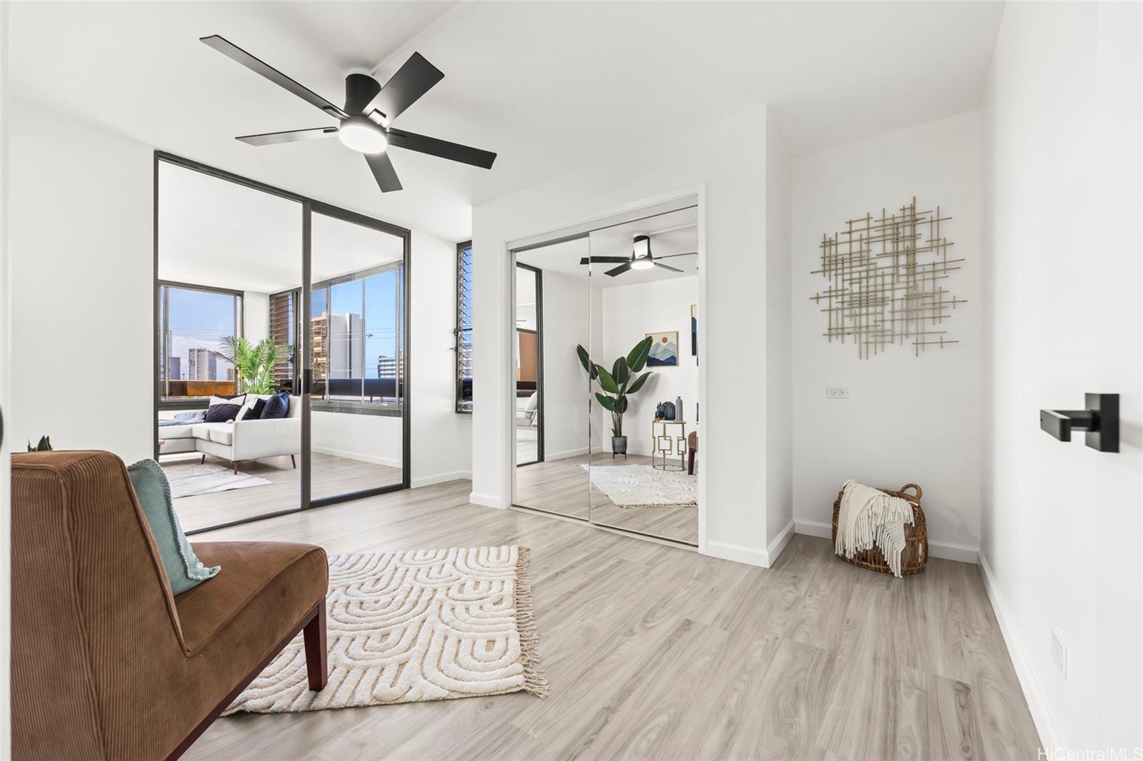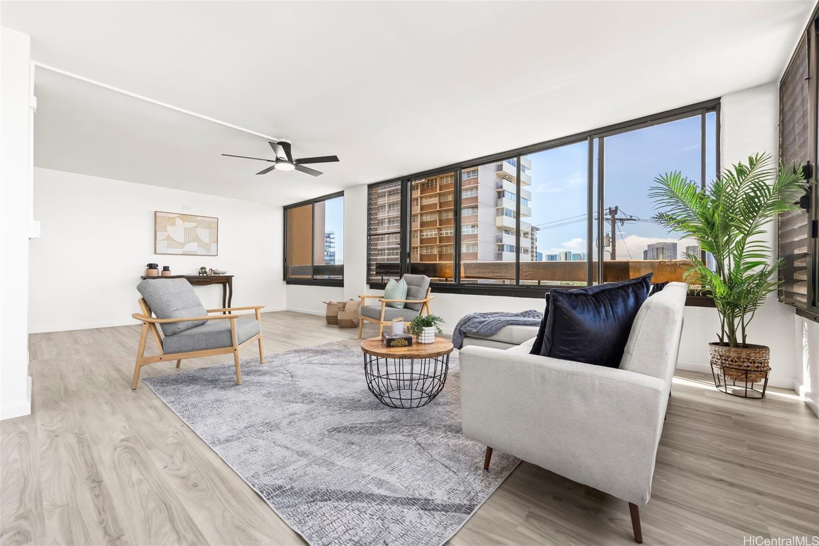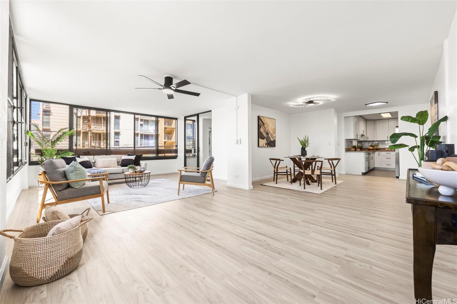 Beautifully renovated condo in Ward Lanai, waiting for a new owner to call it home! This 2-bedroom, 2-bath residence has been tastefully upgraded with sleek, refined finishes, including brand new luxury vinyl plank flooring, stainless steel kitchen appliances, artistic LED light fixtures, bright white cabinetry, and high-contrast black hardware. The living room is lined with large windows that fill the space with natural light and showcase sweeping views of the Honolulu city skyline. Cook up a storm in your fully equipped kitchen, ready to share a meal with your loved ones, and envision yourself soaking in the tub after a long day’s work with a good book. Conveniently located just minutes from Downtown Honolulu, SALT at Kaka’ako, Ala Moana Shopping Center, and some of Oahu’s top high schools, this is a hidden gem you won’t want to miss! Schedule your showing today!