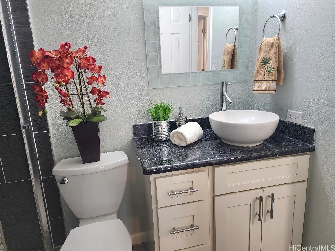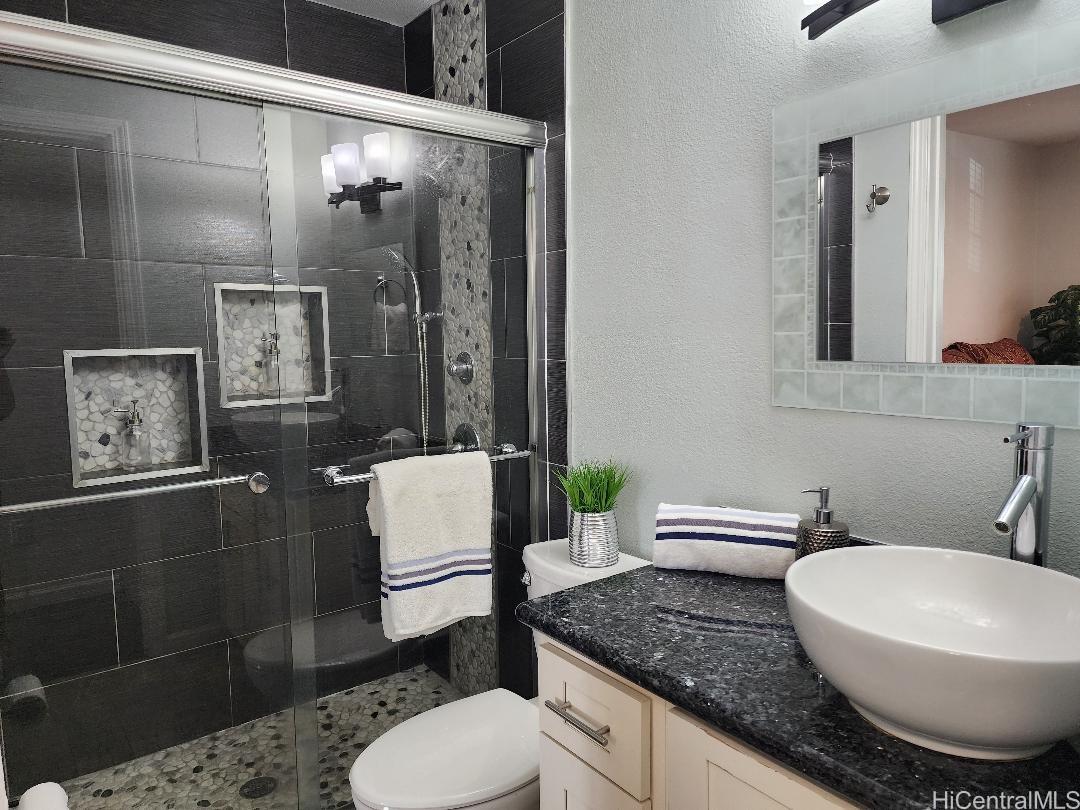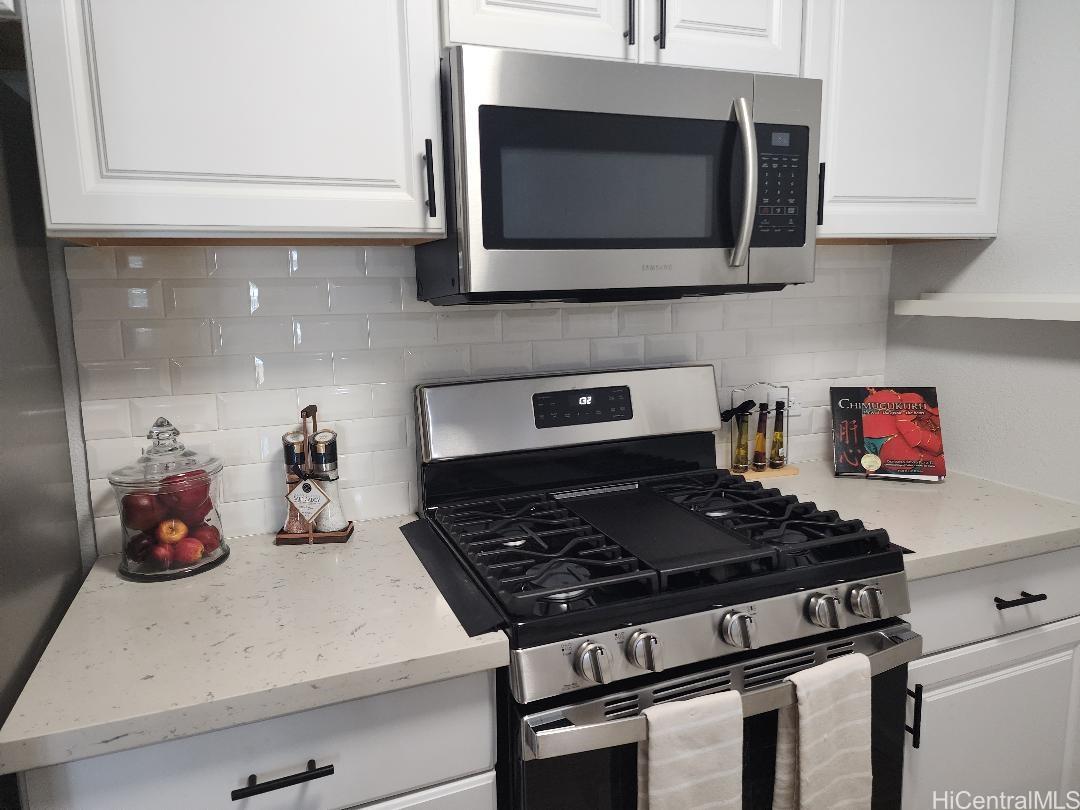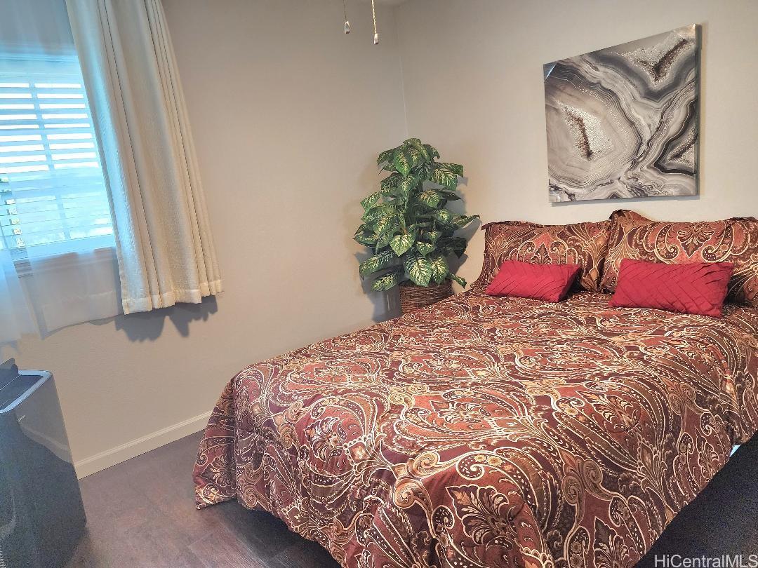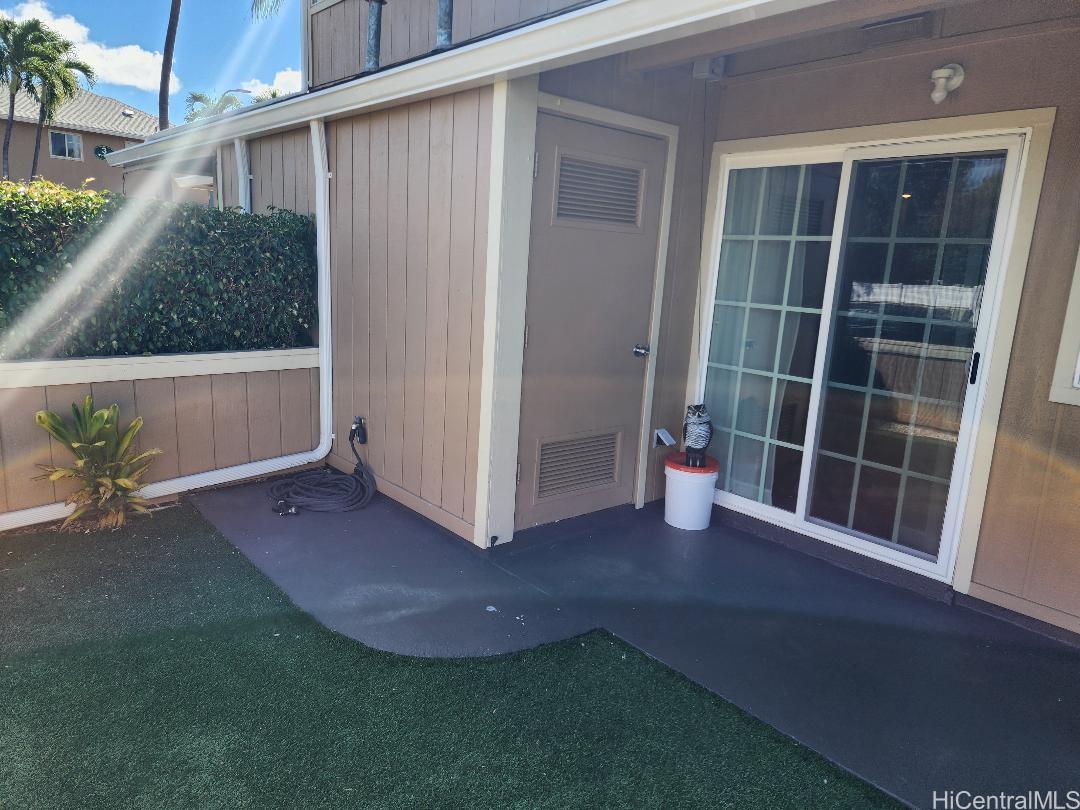 Wow! This beautifully renovated split-level townhome is a true standout in West Loch Fairways. Featuring 2 spacious bedrooms and 2 dedicated parking stalls.Step inside to upgraded wood laminate flooring that flows throughout the home, creating a warm and modern feel. The bathroom has been transformed with a sleek walk-in shower and stunning tile surrounds — a spa-like retreat right at home. In the living room, a custom soffit with recessed lighting adds a touch of elegance, while ceiling fans in every room keep the island breeze circulating. Enjoy the ease of brand-new appliances, including a washer, dryer, and refrigerator, plus a gas range for those who love to cook. The private courtyard is perfect for entertaining, relaxing, or hosting weekend gatherings. This move-in-ready gem is waiting for you. Maintenance fees of $604 includes water/sewer, common area, and cable. Schedule your showing today!