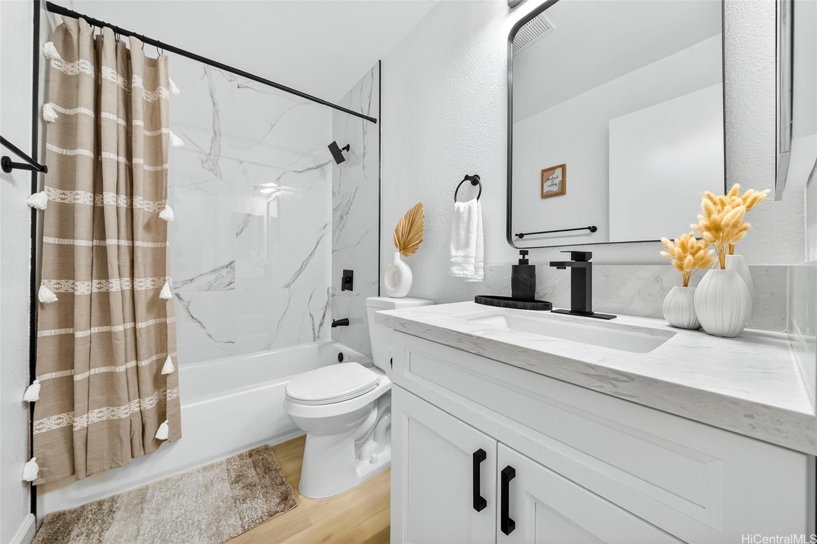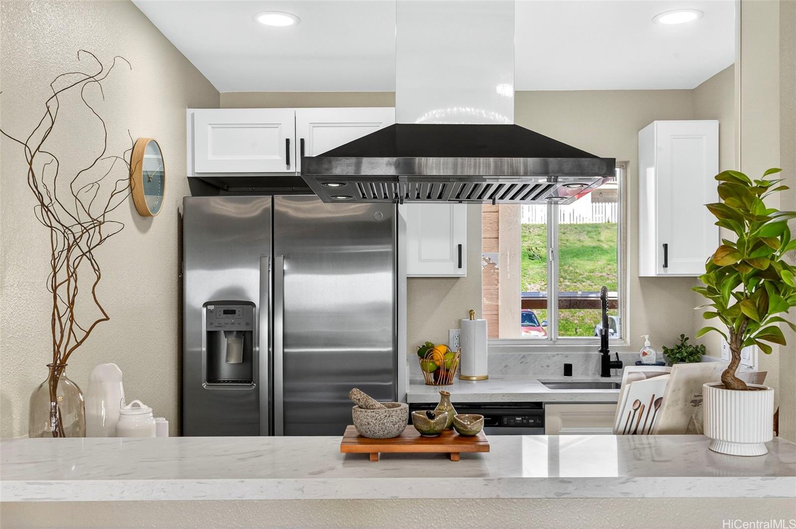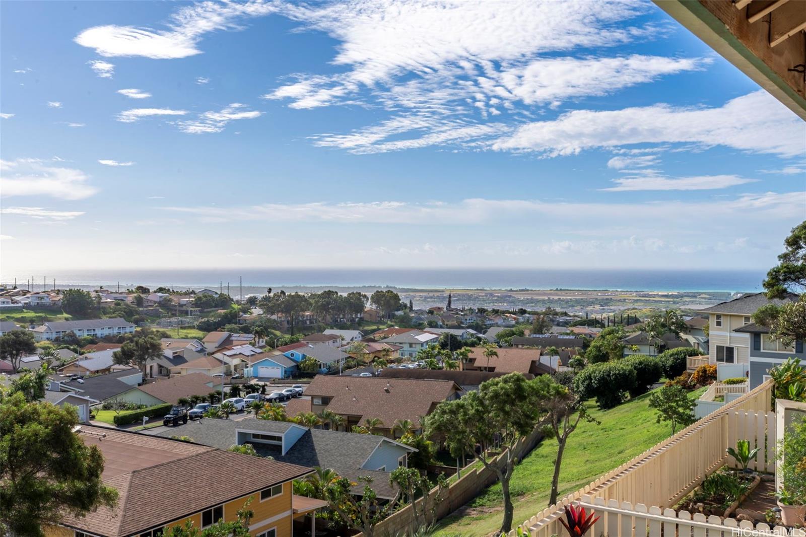 Move-in ready and fully renovated 2-bedroom, 2-bath home in Westview at Makakilo Phase 2 with ocean and mountain views! This beautifully updated unit features luxury vinyl flooring throughout, fresh paint, and all new light fixtures for a bright, modern feel. The kitchen has been upgraded with soft-close shaker cabinets, quartz countertops, and brand-new appliances including a dishwasher. Both bathrooms are fully renovated with stylish finishes and tiled walk- in showers. Enjoy the covered lanai, perfect for relaxing or taking in the views. Conveniently located next to guest parking and mailboxes, with two assigned parking stalls included. Walkingdistance to parks and outdoor spaces. A turnkey home ready for its next owner to move in and enjoy!