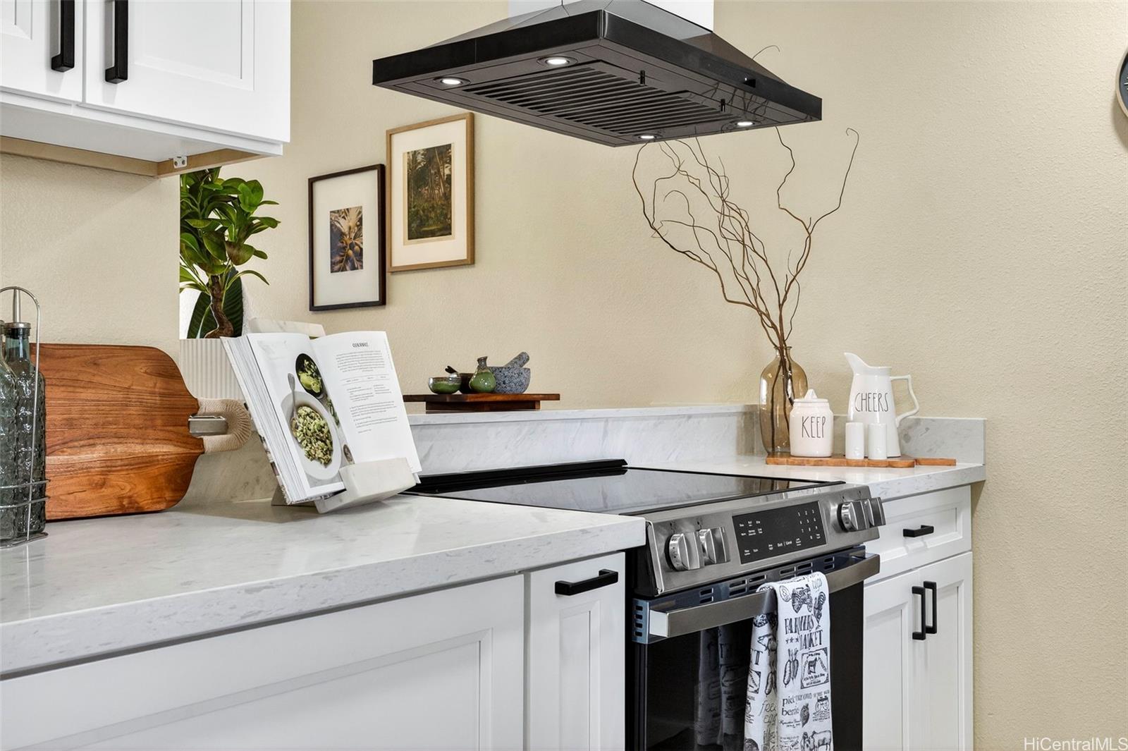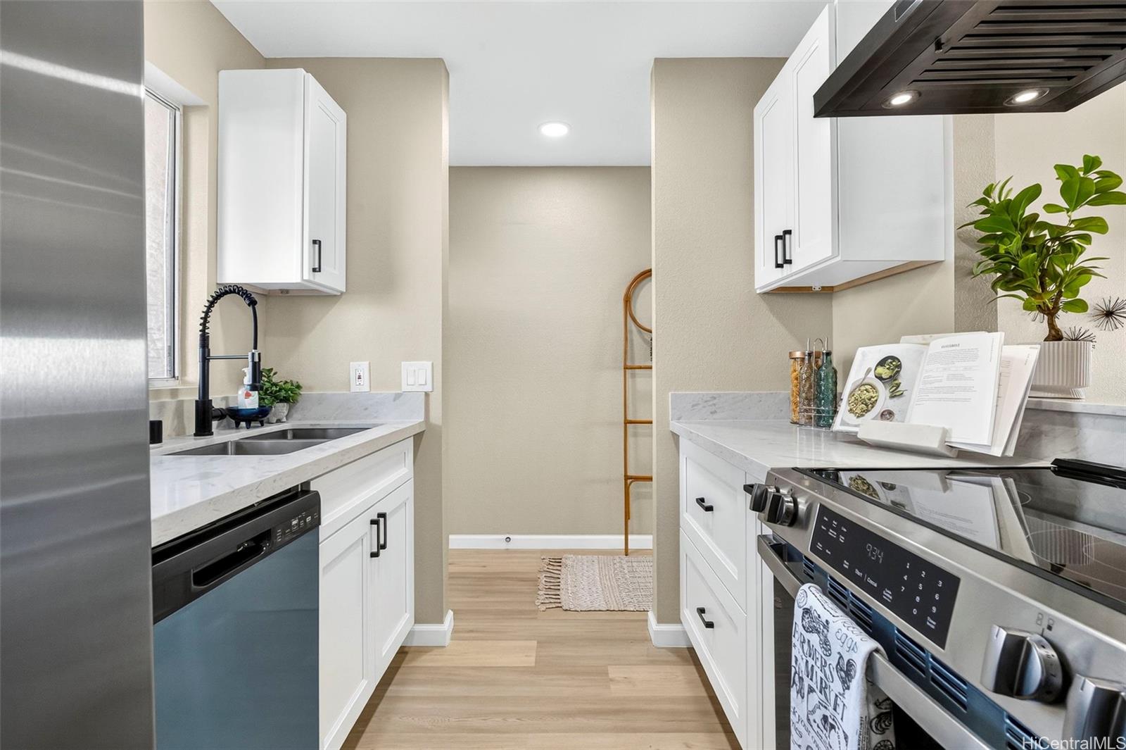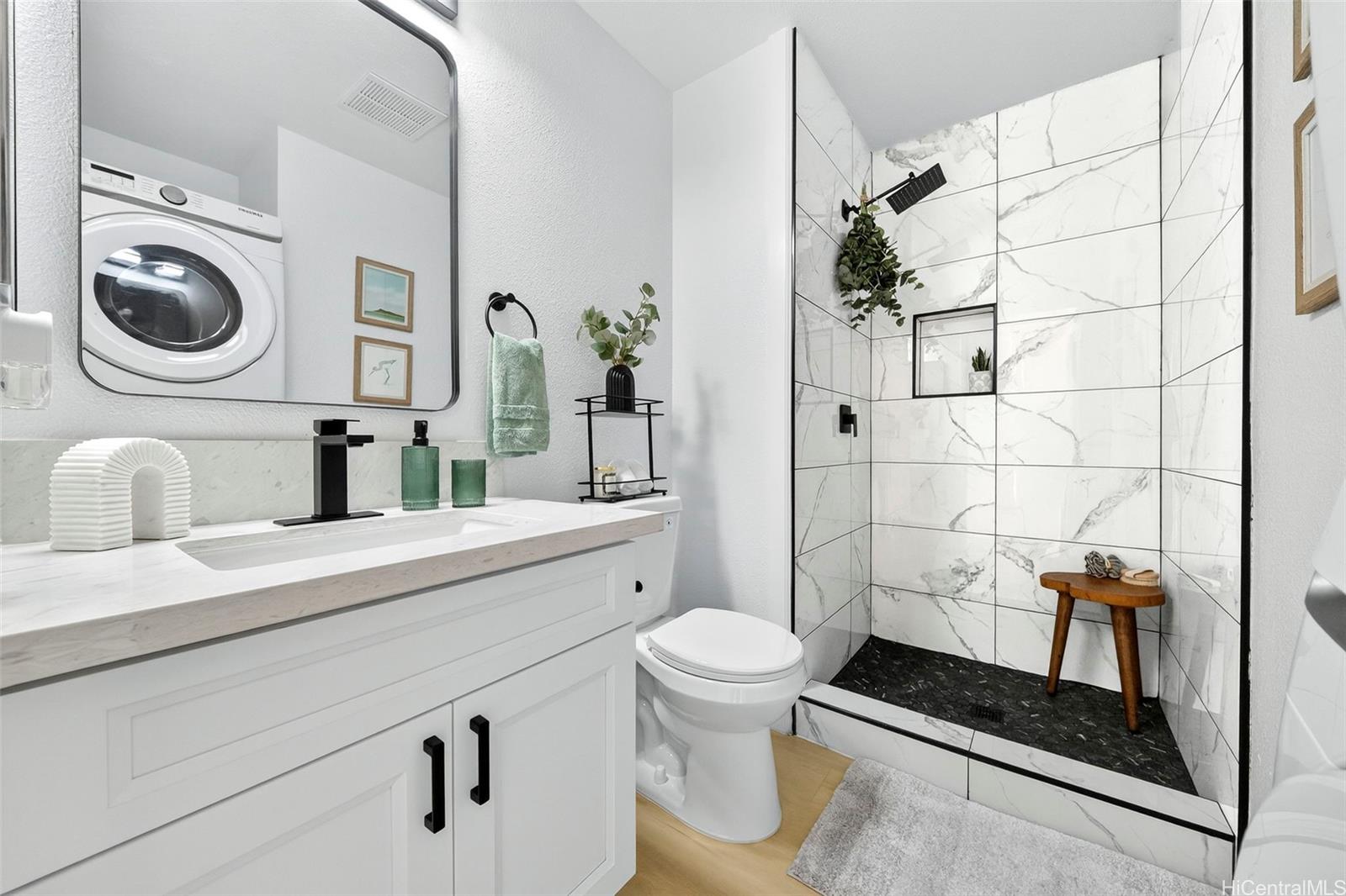 Move-in ready and fully renovated 2-bedroom, 2-bath home in Westview at Makakilo Phase 2 with ocean and mountain views! This beautifully updated unit features luxury vinyl flooring throughout, fresh paint, and all new light fixtures for a bright, modern feel. The kitchen has been upgraded with soft-close shaker cabinets, quartz countertops, and brand-new appliances including a dishwasher. Both bathrooms are fully renovated with stylish finishes and tiled walk- in showers. Enjoy the covered lanai, perfect for relaxing or taking in the views. Conveniently located next to guest parking and mailboxes, with two assigned parking stalls included. Walkingdistance to parks and outdoor spaces. A turnkey home ready for its next owner to move in and enjoy!