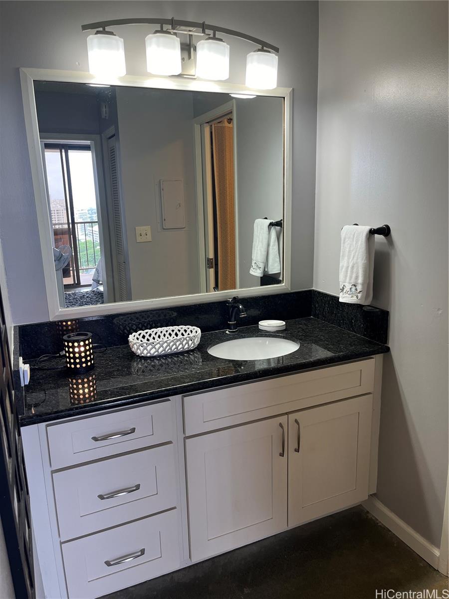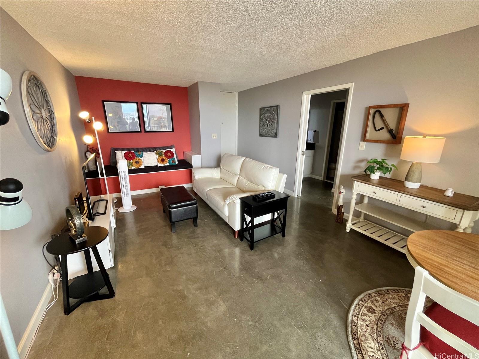 Experience elevated island living in this fully renovated high-floor unit with sweeping panoramic views. This spacious one-bedroom condo offers significantly more square footage than standard one-bedroom units, providing comfort and flexibility. The thoughtfully designed layout includes a cozy daybed for lounging or extra guests, sleek concrete floors, and a generous private lanai perfect for enjoying sunrise coffee or sunset cocktails. Stylish, airy, and modern—this unit has it all.