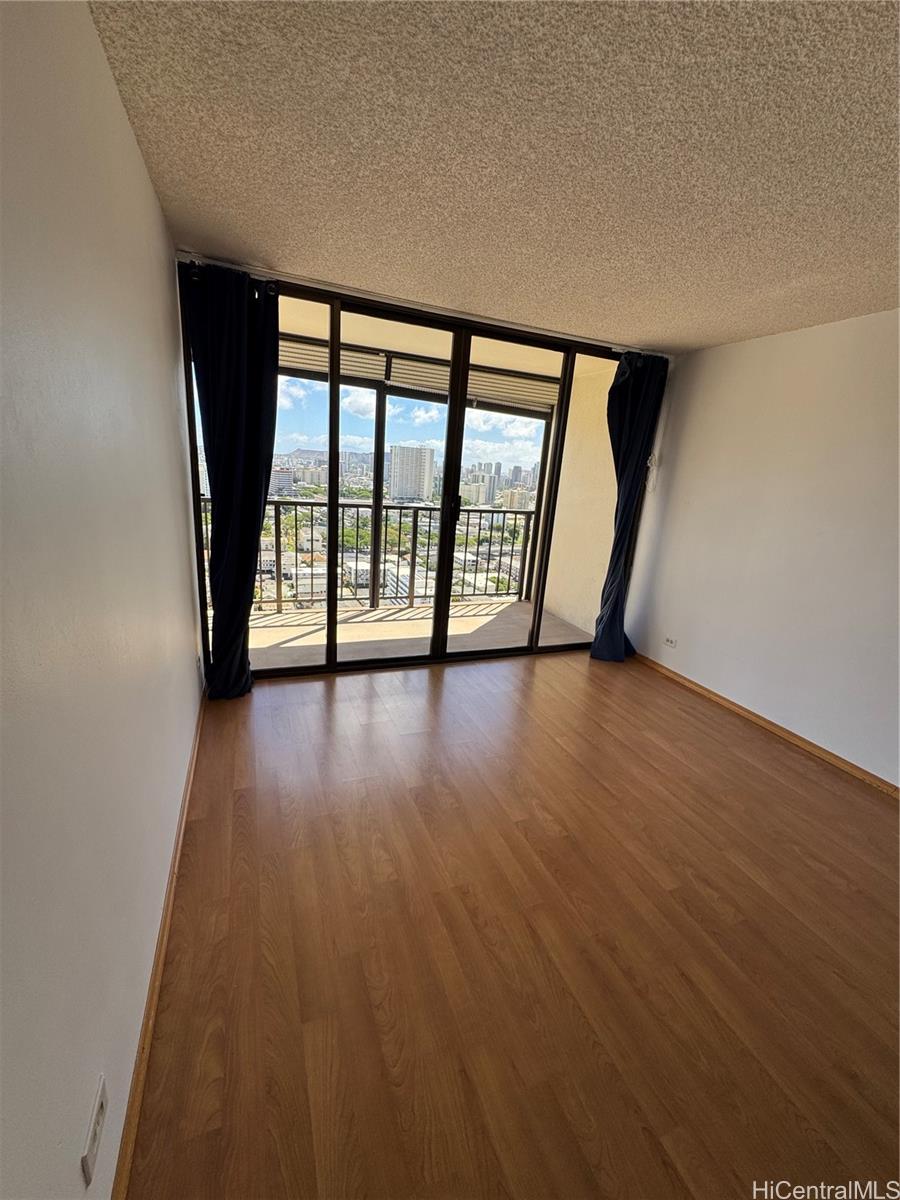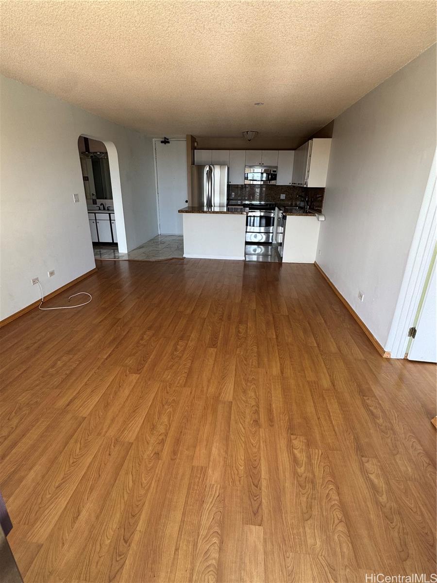 Large One bedroom with a separate den /office area with this part of lanai eclosed so 767 sq ft. interior. Also a nice big lanai 162 sq ft with ocean and mountain virws.This is a secured building and secured covered garage parking #229. Close to shopping, freeways, bus stop, schools. Remodeled laminate floors ,stainless steel appliances in the kitchen granite counters you can use for eating your breakfast and dinner is on. New Washer and Dryer . and Fridge. Bright with cool breezes . Great ammenites Pool. sauna .Whirlpool, resident Mananger.Great Location to Freeways, shopping, schools, fire Station.