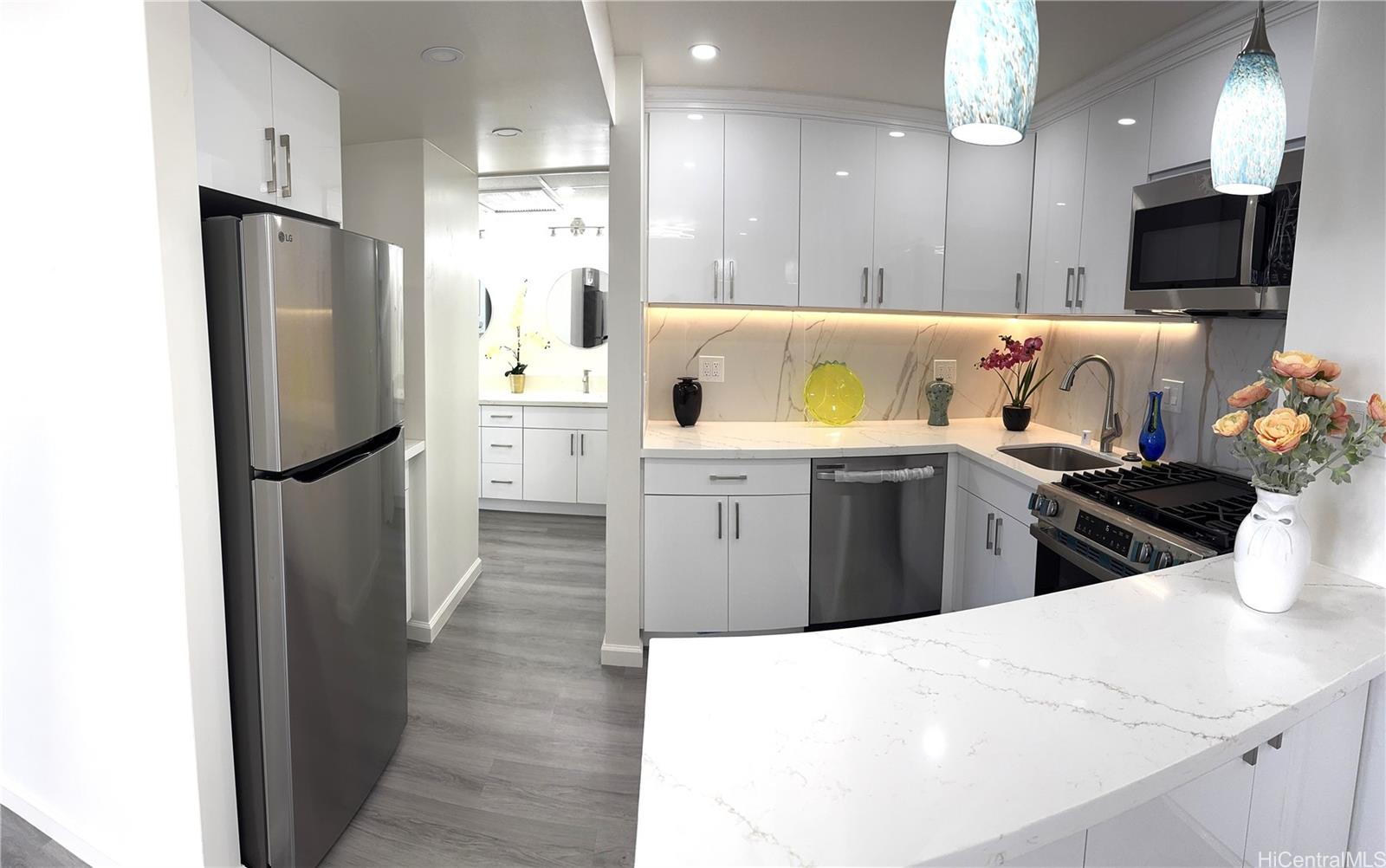 Newly renovated from the ceiling to the floor in a luxury building. One bedroom unit with a spacious living room and has an ocean view. Brand new appliances and new A/C unit. Quartz countertops and luxury vinyl flooring. Located across from the famous open market, Ala Moana Shopping Center, and the beautiful Magic Island.Maintenance fees included all the common expenses, gas, electricity, water, sewer and the internet. Amenities including: tennis and pickleballs court, jacuzzi pool and much more. A Must See